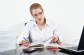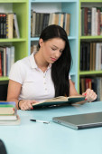 Bardzo kobiece studenta z książek w bibliotece gimnazjum