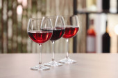 Okulary i butelki z pysznego wina na stole w pomieszczeniu