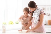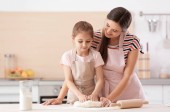 Matka i jej córka, wyrabiania ciasta przy stole w kuchni