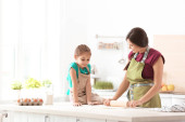 Mała dziewczynka zarabia ciasto przy stole w kuchni