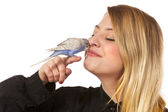 portret piękna dziewczyna z ptaszkiem na rękę