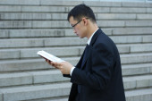 podwójnej ekspozycji, biznesmen z notatnika w ręku podpisywanie dokumentów w konstrukcji witryny pracy koncepcja.