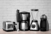 Urządzenia gospodarstwa domowego i kuchni na stole z niewyraźne tło
