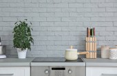Nowoczesna kuchnia wnętrz z nowe meble i inne naczynia