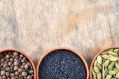 Miski z różnego rodzaju pikantne na drewnianym stole, widok z góry, zbliżenie, selektywnej ostrości.