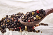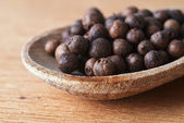 Czarnym sezamem w misce gliny z nasion rozrzuconych na drewniane beczki, zbliżenie, płytkiej głębi ostrości.