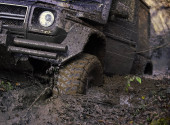 Brudne offroad samochodu z otwartych drzwi tkwi w głębokie koleiny.