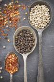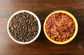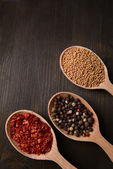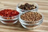 Szklane pojemniki z różne przyprawy i na drewniane beczki, widok z góry, zbliżenie, selektywnej ostrości.
