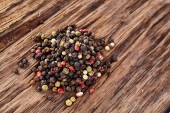 Zdjęcie "Kupie czarnego pieprzu na drewniane bukowe cięcia pokładzie tło, widok z góry, zbliżenie, Selektywny fokus." może być wykorzystywane do celów osobistych i komercyjnych zgodnie z warunkami zakupionej licencji Royalty-free. Obraz jest dostępny do pobrania w jakości wysokiej rozdzielczości do 5760x3840.