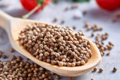 Kupie nasiona kolendry na jasnym tle drewnianych, zbliżenie, makro, płytkiej głębi ostrości.
