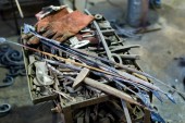 Metalowe narzędzia w warsztacie kowali, zbliżenie, Selektywny fokus, pracy nikt nie