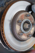 Przednia tarcza hamulcowa w samochodzie w procesie wymiany opon. Usuwa się obręcz z przednim wirnikiem i zaciskiem.