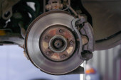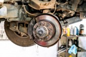 Przednia tarcza hamulcowa w samochodzie w procesie wymiany opon. Usuwa się obręcz z przednim wirnikiem i zaciskiem.