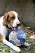 Szczęśliwy Rudowłosa Beagle pies, z piłką, leżąc na trawie. Pies jest zbliżenie.