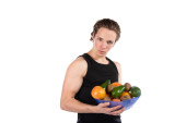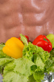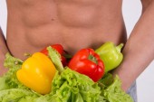 Sport i dieta. Atrakcyjny mężczyzna z mięśni ciała. Facet atletyczny i warzywa. Zdrowe odżywianie