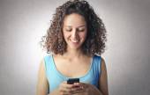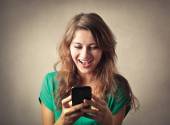 Podekscytowany młoda kobieta Afro oglądania jej smartphone i doping.