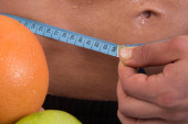 Zdjęcie "Sport i dieta. Atrakcyjny mężczyzna z mięśni ciała. Facet atletyczny i owoce. Pomiaru taśmy ciała człowieka. Zdrowe odżywianie" może być wykorzystywane do celów osobistych i komercyjnych zgodnie z warunkami zakupionej licencji Royalty-free. Obraz jest dostępny do pobrania w jakości wysokiej rozdzielczości do 5760x3840.