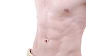 Młody atrakcyjny kulturysta. Facet z pięknego ciała mięśni, shirtless. Zdrowy styl życia i siłownia.