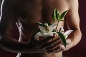 Przystojny mężczyzna i kwiaty. Miłość i romans. Nagi mężczyzna trzyma kwiaty.