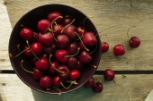 Zdjęcie "Blachy z czerwone wiśnie na drewnianym stole." może być wykorzystywane do celów osobistych i komercyjnych zgodnie z warunkami zakupionej licencji Royalty-free. Obraz jest dostępny do pobrania w jakości wysokiej rozdzielczości do 5760x3840.