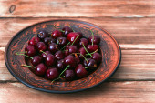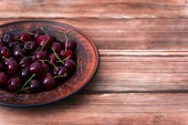 Blachy z czerwone wiśnie na drewnianym stole.