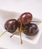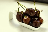 Czerwone wiśnie na biały łyżką, na drewnianym stole.