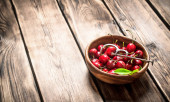 Czerwone wiśnie na drewno do cięcia i wszystko na stół z drewna sosnowego.