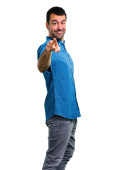 Przystojny mężczyzna, wskazując palcem na bok i prezentacji produktu