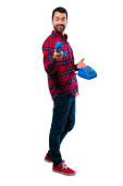 Przystojny mężczyzna, prezentując i zapraszając do kontaktu