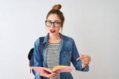 Wizerunek studenta całkiem Ładna panienka, stojąc na białym tle nad szarym tle ściany prowadzące księgę.