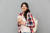 Wizerunek pięknej niesamowite uczeń panienka stojąc na białym tle nad szarym tle ściany trzymając książki Marka kciuki gest.