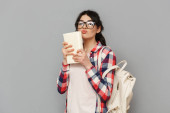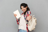 Smutny obraz niezadowolony student młoda dama, stojąc na białym tle nad szarym tle ściany prowadzące księgę.