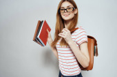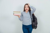 Wizerunek student szczęśliwy panienka, stojąc na białym tle nad szarym tle ściany trzymania książek.