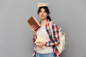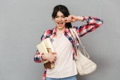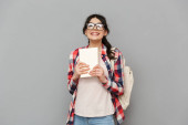 Wizerunek student szczęśliwy panienka, stojąc na białym tle nad szarym tle ściany trzymania książek.