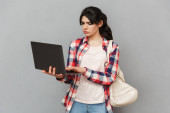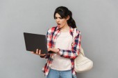 Obrazu, niesamowity studenta emocjonalnych panienka stojąc na białym tle nad szarym tle ściany wyświetlone laptopa.
