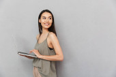 Zdjęcie "Obrazu, niesamowity studenta emocjonalnych panienka stojąc na białym tle nad szarym tle ściany wyświetlone laptopa." może być wykorzystywane do celów osobistych i komercyjnych zgodnie z warunkami zakupionej licencji Royalty-free. Obraz jest dostępny do pobrania w jakości wysokiej rozdzielczości do 5760x3840.
