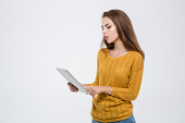Zdjęcie "Wizerunek smutny panienka niezadowolony student na białym tle nad szarym tle ściany za pomocą komputera przenośnego." może być wykorzystywane do celów osobistych i komercyjnych zgodnie z warunkami zakupionej licencji Royalty-free. Obraz jest dostępny do pobrania w jakości wysokiej rozdzielczości do 5760x3840.