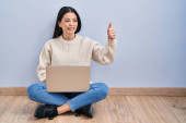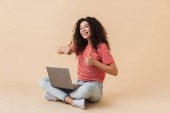 Wizerunek student szczęśliwy panienka na białym tle nad szarym tle ściany trzymając kciuki make komputer laptop.