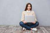 Wizerunek smutny panienka niezadowolony student na białym tle nad szarym tle ściany za pomocą komputera przenośnego.
