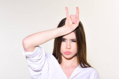 Zdjęcie z panienka wziąć kieliszek Ci gestykulacji rękami, jak fotografować na białym tle nad szarym tle ściany.