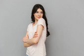 Zdjęcie z myślenia Ładna panienka stojąc na białym tle nad szarym tle ściany patrząc na bok.