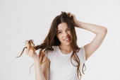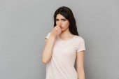 Zdjęcie "Obraz z słodkie piękne panienki, stojąc na białym tle nad szarym tle ściany Wyświetlono języka." może być wykorzystywane do celów osobistych i komercyjnych zgodnie z warunkami zakupionej licencji Royalty-free. Obraz jest dostępny do pobrania w jakości wysokiej rozdzielczości do 5760x3840.