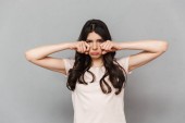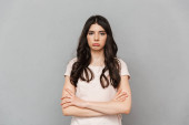 Wizerunek niezadowolony smutny panienka, stojąc na białym tle nad szarym tle ściany.