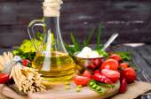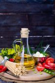 Differens olej z kilka włoskie spaghetti, makaron raw soba i comen, awokado z pomidorami na stare drewniane tła, miejsce. Koncepcja gotowania domowe jedzenie z miejsca kopii