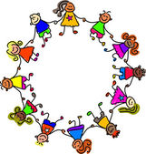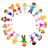 Dzieci trzymają się za ręce. Grupa wesołych, uśmiechniętych dzieci trzymających się za ręce w kręgu. Kreskówka radosnych dzieci.