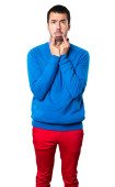 Przystojny, młody człowiek, obejmujące jego uszy na białym tle