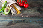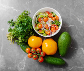 Zdjęcie "Świeże składniki organiczne do podejmowania sałatka: avocado, pomidor, rzodkiewka, ogórek, cytryny, chili na kamień ciemne tło, widok z góry. Z płaskim leżał z miejscem dla tekstu. Koncepcja zdrowej żywności i wegańskie" może być wykorzystywane do celów osobistych i komercyjnych zgodnie z warunkami zakupionej licencji Royalty-free. Obraz jest dostępny do pobrania w jakości wysokiej rozdzielczości do 5760x3840.