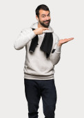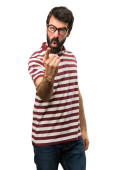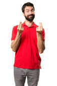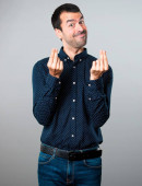 Przystojny, młody człowiek podejmowania pieniędzy gest na białym tle