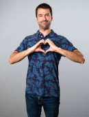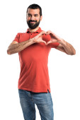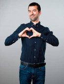 Przystojny, młody człowiek, co serce z rękami na białym tle