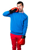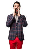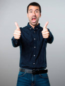 Przystojny młody mężczyzna Dokonywanie silny gest na białym tle